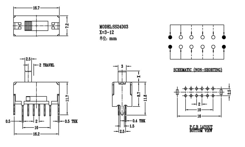 正拨拨动开关主要技術參數 使用功率/額定值:DC 50V 0.3A~1A 觸點電阻:< 100 mΩ 絕緣電阻:≥ 100 MΩ 耐壓:500V AC for 1 minute 撥動力:180~500gf 使用壽命:10000次 操作溫度:-16℃to+60℃ 儲存溫度:-40℃to+85℃ 符合標準:RoHs&Reach