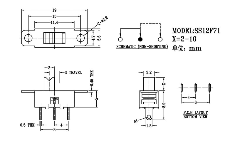正拨拨动开关主要技術參數 使用功率/額定值:DC 50V 0.3A~1A 觸點電阻:< 100 mΩ 絕緣電阻:≥ 100 MΩ 耐壓:500V AC for 1 minute 撥動力:180~500gf 使用壽命:10000次 操作溫度:-16℃to+60℃ 儲存溫度:-40℃to+85℃ 符合標準:RoHs&Reach