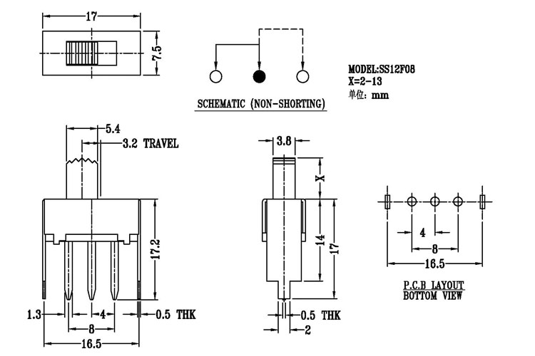 正拨拨动开关主要技術參數 使用功率/額定值:DC 50V 0.3A~1A 觸點電阻:< 100 mΩ 絕緣電阻:≥ 100 MΩ 耐壓:500V AC for 1 minute 撥動力:180~500gf 使用壽命:10000次 操作溫度:-16℃to+60℃ 儲存溫度:-40℃to+85℃ 符合標準:RoHs&Reach