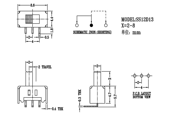 正拨拨动开关主要技術參數 使用功率/額定值:DC 50V 0.3A~1A 觸點電阻:< 100 mΩ 絕緣電阻:≥ 100 MΩ 耐壓:500V AC for 1 minute 撥動力:180~500gf 使用壽命:10000次 操作溫度:-16℃to+60℃ 儲存溫度:-40℃to+85℃ 符合標準:RoHs&Reach