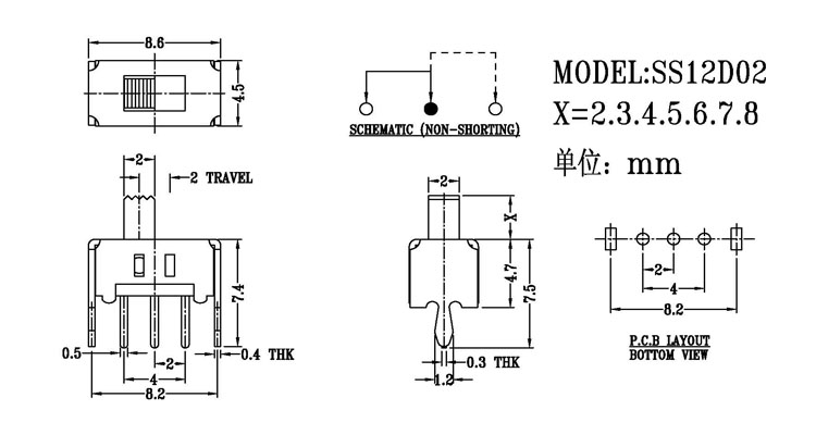 正拨拨动开关主要技術參數 使用功率/額定值:DC 50V 0.3A~1A 觸點電阻:< 100 mΩ 絕緣電阻:≥ 100 MΩ 耐壓:500V AC for 1 minute 撥動力:180~500gf 使用壽命:10000次 操作溫度:-16℃to+60℃ 儲存溫度:-40℃to+85℃ 符合標準:RoHs&Reach