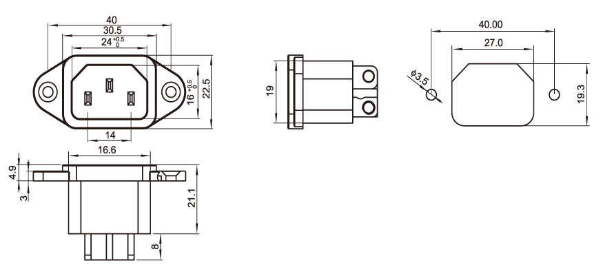 标准:IEC 60320 C14 额定功率:2.5A 250V AC 绝缘电阻:100MΩ 500V DC/1分钟 绝缘强度:2000V AC/1分钟 外壳材料:热塑性塑料 94V-2~V-0