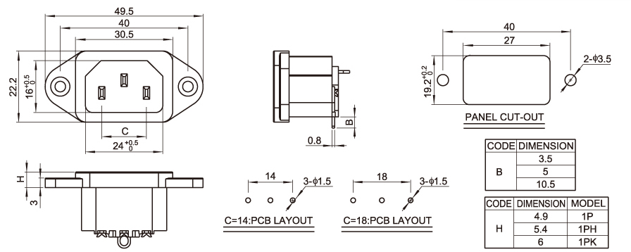 标准:IEC 60320 C14 额定功率:2.5A 250V AC 绝缘电阻:100MΩ 500V DC/1分钟 绝缘强度:2000V AC/1分钟 外壳材料:热塑性塑料 94V-2~V-0