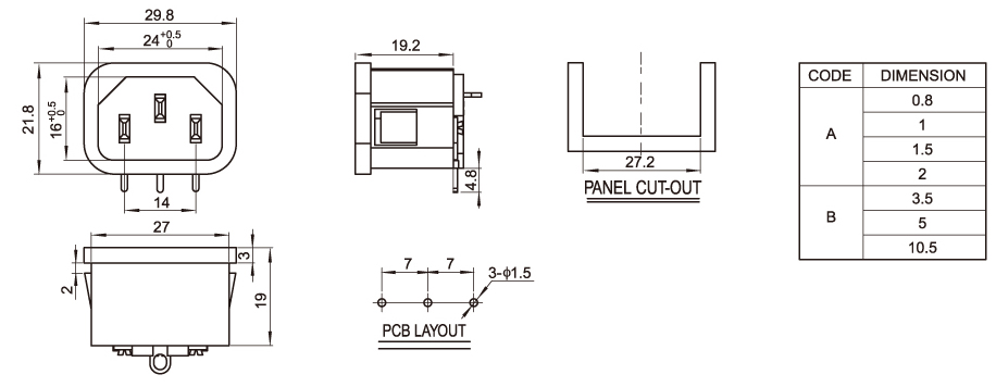 型 号:DB-14-4AP-S55: 关健词:品字尾插座、品字尾电源插座、品字插座、AC电源插座、器具插座 用 途:小家电品字电源;主机机箱插座;电瓶车电源插座;电器插座 尺 寸:29.8*21.8 电流电压:10A 250V