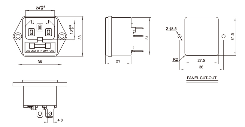 标准:IEC 60320 C14 额定功率:2.5A 250V AC 绝缘电阻:100MΩ 500V DC/1分钟 绝缘强度:2000V AC/1分钟 外壳材料:热塑性塑料 94V-2~V-0