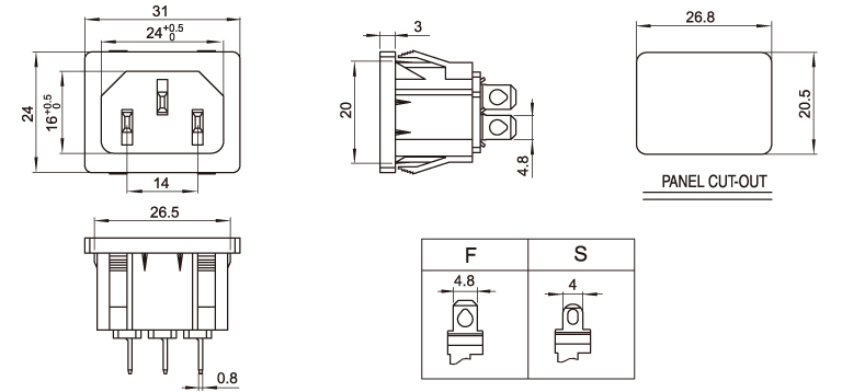 型 号:DB-14-5A: 关健词:品字尾插座、品字尾电源插座、品字插座、AC电源插座、器具插座 用 途:小家电品字电源;主机机箱插座;电瓶车电源插座;电器插座 尺 寸:31*24 电流电压:10A 250V
