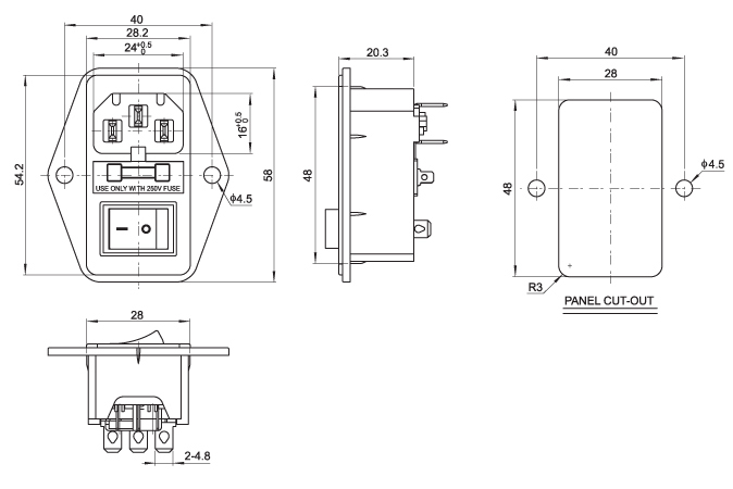 型 号:DB-14-F5:三合一插座带保险丝开关 用 途:小家电品字电源;主机机箱插座;电瓶车电源插座;电器插座;运动器材电源插座 尺 寸:40*58 电流电压:10A 250V