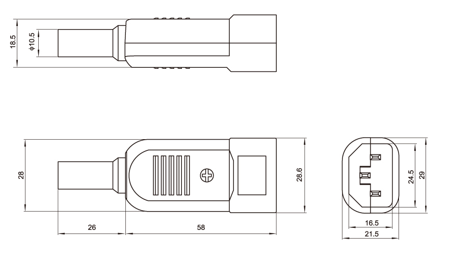 标准:IEC 60320 E 额定值:10A 250V AC 绝缘电阻:100MΩ500V DC / 1分钟 介电强度:2000V AC / 1分钟 外壳材料:热塑性塑料94V-2〜V-0