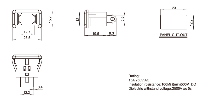 型 号:DB-F-M4: 关健词:美式插座、 美标插座 、美式电源线插座 用途:逆变器插座;电动车电瓶车插座;美标插座;AC电源插座 尺 寸:25.5*15.7 电流电压:10A 250V