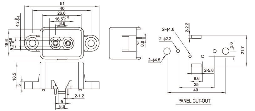 型 号:DB-8-7DP25: 关健词:八字插座:八字尾插座;适配器电源插座 用 途:电源适配器:笔记本电源;医疗器械电源;充电器; 尺 寸:51*18.6 电流电压:2.5A 250V