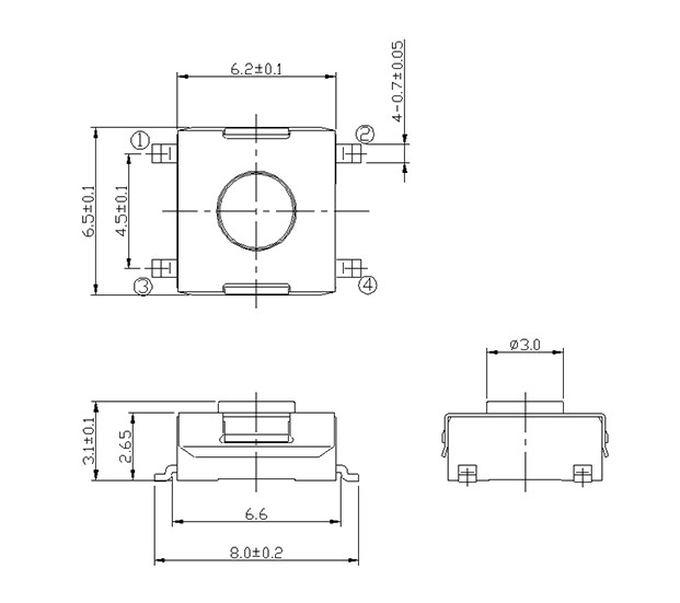 尺寸: 6.2X6.2mm 产品分类: 轻触开关 - E系列 / 6.2x6.2 应用 ※ 各种电子设备像音响设备,办公设备,通讯设备,测试仪器,电视机,录像机,汽车等 特点 ※ 回流可焊 ※ 可做防静电接地脚 ※ 用16mm宽的印花编带包装 ※ 用于高速SMT处理