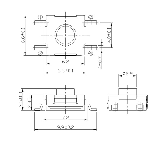 尺寸: 6.2X6.2mm 产品分类: 轻触开关 - E系列 / 6.2x6.2 应用 ※ 家电 ※ 汽车导航系统,汽车音响系统 ※ 各种电子设备像音响设备,办公设备,通讯设备,测试仪器,电视机,录像机,汽车等 特点 ※ 橡胶按钮提供优秀的操作性 ※ 回流可焊 ※ 用16mm宽的印花编带包装