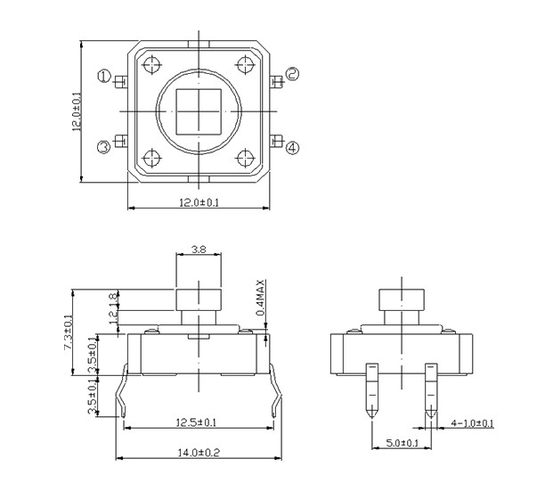 尺寸: 12.0X12.0mm 产品分类: 轻触开关 - G系列 / 12x12 应用 ※ 各种电子设备像音响设备,办公设备,通讯设备,测试仪器,电视机,录像机,汽车等 特点 ※ 插脚类型,可以直接安在PCB上 ※ 一些输出脚可以做为引脚让电路设计更简单 ※ 标准的帽子是可以做的
