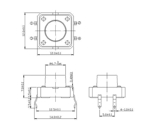 尺寸: 12.0X12.0mm 产品分类: 轻触开关 - G系列 / 12x12 应用 ※ 各种电子设备像音响设备,办公设备,通讯设备,测试仪器,电视机,录像机,汽车等 特点 ※ 插脚类型,可以直接安在PCB上 ※ 一些输出脚可以做为引脚让电路设计更简单 ※ 标准的帽子是可以做的