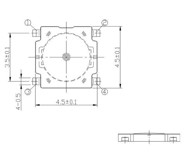 尺寸: 4.5x4.5mm 产品分类: 轻触开关 - C系列 / 5.2, 4.5, 4.8 应用 ※ 用于操作各种像手机,通讯设备之类的设备 ※ 录像机,相机,音频设备 ※ 低面和轻量级的设计 特点 ※ 4.5x4.5x0.5mm尺寸图,适用于高密度安装 ※ 回流可焊 ※ 用12mm宽的编带包装
