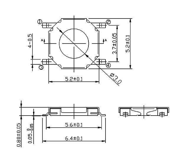 尺寸: 5.2X5.2mm 产品分类: 轻触开关 - C系列 / 5.2, 4.5, 4.8 应用 ※ 用于操作各种像音响之类的电子设备 ※ 录像机,通讯设备,相机,汽车等 ※ 家电等 特点 ※ 5.2x5.2尺寸图,适用于高密度安装 ※ 0.8mm高的平脚类型,用于薄型设计.带柄类型追求更简易的使用. ※ 触点封装结构使开关可靠性更高 ※ 回流可焊 ※ 用12mm宽的编带包装