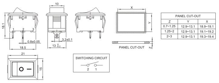 15*21二档小角 船型开关 跷板开关 IO电源开关 1.额定工作电压、电流Rating 3A/6A/15A 250V 2.使用温度范围Temperature -25+85℃ 3.接触电阻Contact Resistance <0.03Ω 4.动作力Actuating Force 1.3+0.5N 5.绝缘电阻Insulation Resistance >100MΩ 6.寿命(switching Life) 10000次