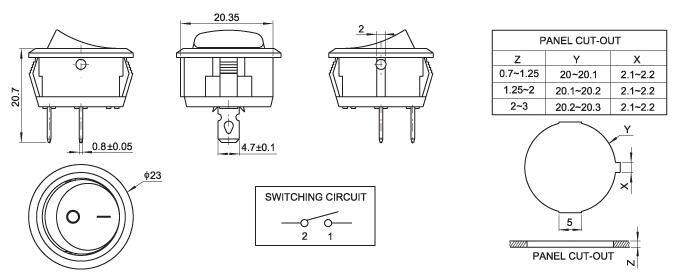 15*21二档二角 船型开关 跷板开关 IO电源开关 1.额定工作电压、电流Rating 3A/6A/15A 250V 2.使用温度范围Temperature -25+85℃ 3.接触电阻Contact Resistance <0.03Ω 4.动作力Actuating Force 1.3+0.5N 5.绝缘电阻Insulation Resistance >100MΩ 6.寿命(switching Life) 10000次