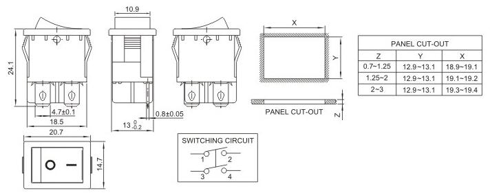 15*21二档二角 船型开关 跷板开关 IO电源开关 1.额定工作电压、电流Rating 3A/6A/15A 250V 2.使用温度范围Temperature -25+85℃ 3.接触电阻Contact Resistance <0.03Ω 4.动作力Actuating Force 1.3+0.5N 5.绝缘电阻Insulation Resistance >100MΩ 6.寿命(switching Life) 10000次