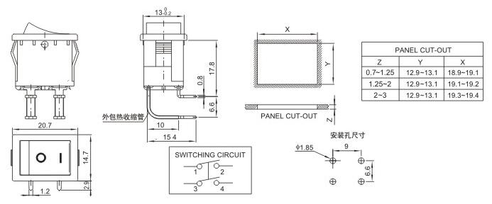 15*21二档二角 船型开关 跷板开关 IO电源开关 1.额定工作电压、电流Rating 3A/6A/15A 250V 2.使用温度范围Temperature -25+85℃ 3.接触电阻Contact Resistance <0.03Ω 4.动作力Actuating Force 1.3+0.5N 5.绝缘电阻Insulation Resistance >100MΩ 6.寿命(switching Life) 10000次