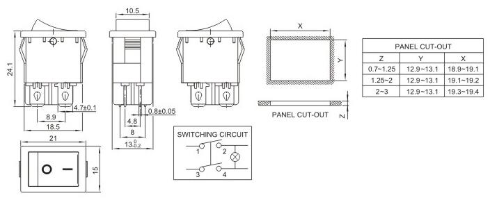 15*21二档二角 船型开关 跷板开关 IO电源开关 1.额定工作电压、电流Rating 3A/6A/15A 250V 2.使用温度范围Temperature -25+85℃ 3.接触电阻Contact Resistance <0.03Ω 4.动作力Actuating Force 1.3+0.5N 5.绝缘电阻Insulation Resistance >100MΩ 6.寿命(switching Life) 10000次