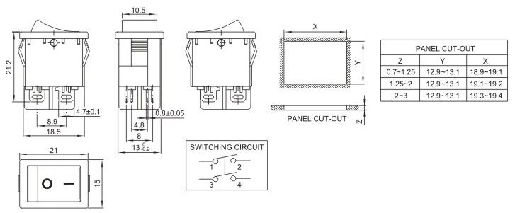 15*21二档二角 船型开关 跷板开关 IO电源开关 1.额定工作电压、电流Rating 3A/6A/15A 250V 2.使用温度范围Temperature -25+85℃ 3.接触电阻Contact Resistance <0.03Ω 4.动作力Actuating Force 1.3+0.5N 5.绝缘电阻Insulation Resistance >100MΩ 6.寿命(switching Life) 10000次