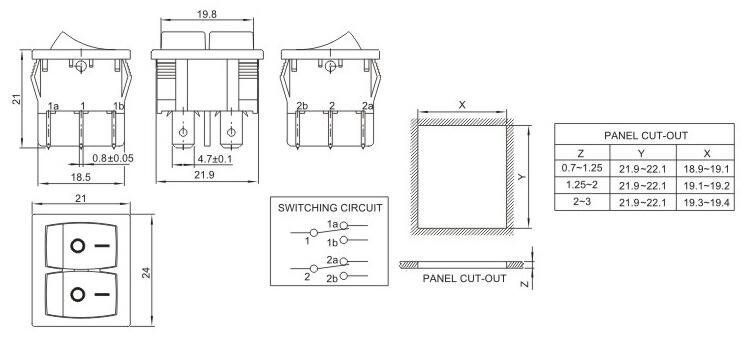 15*21 船型开关 跷板开关 IO电源开关 1.额定工作电压、电流Rating 3A/6A/15A 250V 2.使用温度范围Temperature -25+85℃ 3.接触电阻Contact Resistance <0.03Ω 4.动作力Actuating Force 1.3+0.5N 5.绝缘电阻Insulation Resistance >100MΩ 6.寿命(switching Life) 10000次