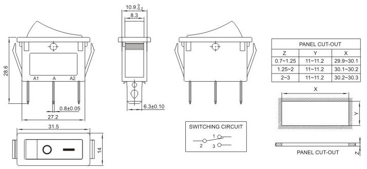 14*31.5 船型开关 跷板开关 IO电源开关 1.额定工作电压、电流Rating 3A/6A/15A 250V 2.使用温度范围Temperature -25+85℃ 3.接触电阻Contact Resistance <0.03Ω 4.动作力Actuating Force 1.3+0.5N 5.绝缘电阻Insulation Resistance >100MΩ 6.寿命(switching Life) 10000次