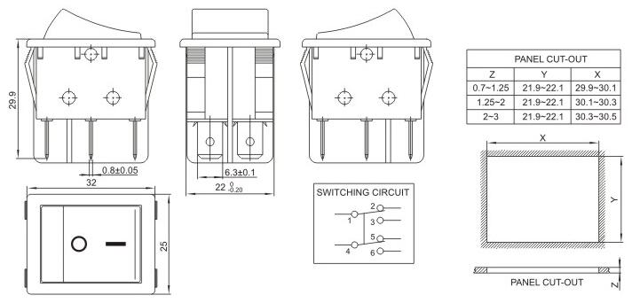25*32 船型开关 跷板开关 IO电源开关 1.额定工作电压、电流Rating 3A/6A/15A 250V 2.使用温度范围Temperature -25+85℃ 3.接触电阻Contact Resistance <0.03Ω 4.动作力Actuating Force 1.3+0.5N 5.绝缘电阻Insulation Resistance >100MΩ 6.寿命(switching Life) 10000次
