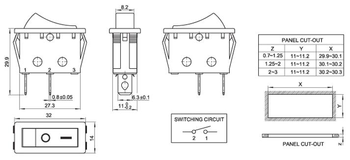 14*32 船型开关 跷板开关 IO电源开关 1.额定工作电压、电流Rating 3A/6A/15A 250V 2.使用温度范围Temperature -25+85℃ 3.接触电阻Contact Resistance <0.03Ω 4.动作力Actuating Force 1.3+0.5N 5.绝缘电阻Insulation Resistance >100MΩ 6.寿命(switching Life) 10000次