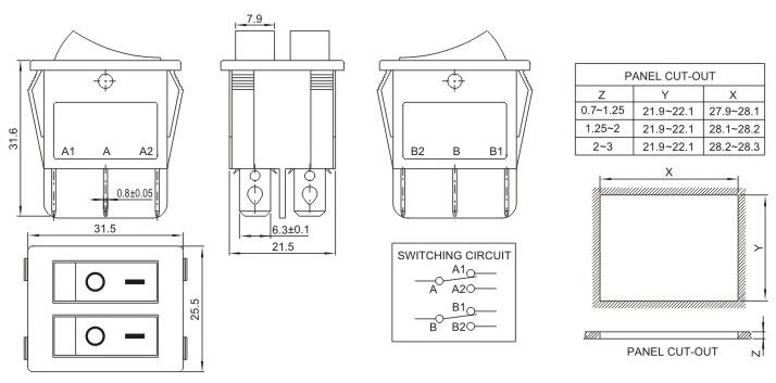 25*31.5 船型开关 跷板开关 IO电源开关 1.额定工作电压、电流Rating 3A/6A/15A 250V 2.使用温度范围Temperature -25+85℃ 3.接触电阻Contact Resistance <0.03Ω 4.动作力Actuating Force 1.3+0.5N 5.绝缘电阻Insulation Resistance >100MΩ 6.寿命(switching Life) 10000次