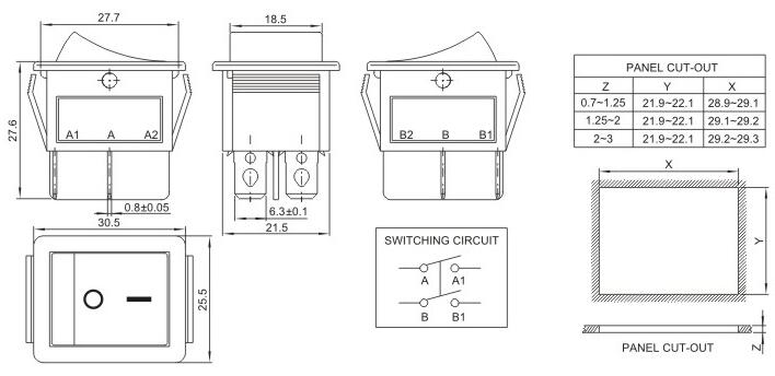 25*30.5 船型开关 跷板开关 IO电源开关 1.额定工作电压、电流Rating 3A/6A/15A 250V 2.使用温度范围Temperature -25+85℃ 3.接触电阻Contact Resistance <0.03Ω 4.动作力Actuating Force 1.3+0.5N 5.绝缘电阻Insulation Resistance >100MΩ 6.寿命(switching Life) 10000次