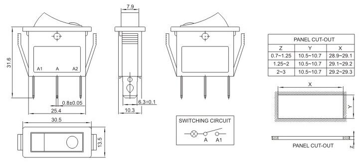 13*30.5 red lights Ship type switch Rocker switch IO power switch 13*30.5 红色带灯 船型开关 跷板开关 IO电源开关 1.额定工作电压、电流Rating 3A/6A/15A 250V 2.使用温度范围Temperature -25+85℃ 3.接触电阻Contact Resistance <0.03Ω 4.动作力Actuating Force 1.3+0.5N 5.绝缘电阻Insulation Resistance >100MΩ 6.寿命(switching Life) 10000次
