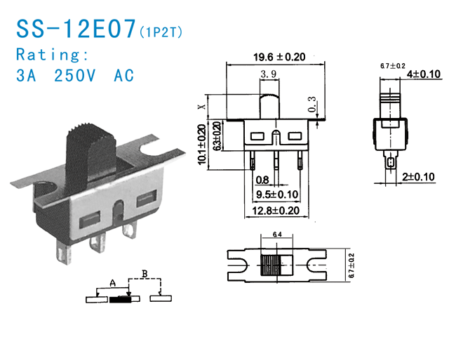 工作温度范围Operating temperature range:-30℃ to+85℃ 额定电流Rating:3A 250V AC 绝缘电阻Insulation resistance: 100MΩ min.500V DC 接触电阻Contact resistance: 30m Ω max. 操作力度Operating fore:250±100gf 寿命Life time:10000 cycles(依产品而定)