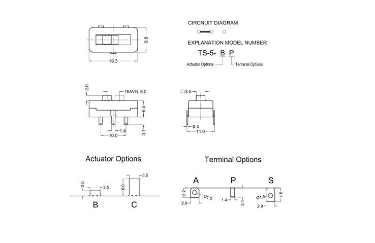 工作温度范围Operating temperature range:-30℃ to+85℃ 额定电流Rating:3A 250V AC 绝缘电阻Insulation resistance: 100MΩ min.500V DC 接触电阻Contact resistance: 30m Ω max. 操作力度Operating fore:250±100gf 寿命Life time:10000 cycles(依产品而定)