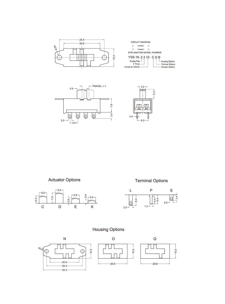 工作温度范围Operating temperature range:-30℃ to+85℃ 额定电流Rating:3A 250V AC 绝缘电阻Insulation resistance: 100MΩ min.500V DC 接触电阻Contact resistance: 30m Ω max. 操作力度Operating fore:250±100gf 寿命Life time:10000 cycles(依产品而定)