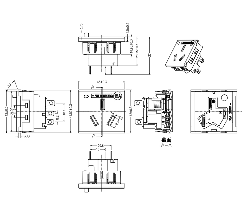 型 号:L-BD-6三孔国标卡入式 用 途:桌面国标模块、PDU机柜国标模块、升降国标模块 尺 寸:51*42 功能:16A 250V