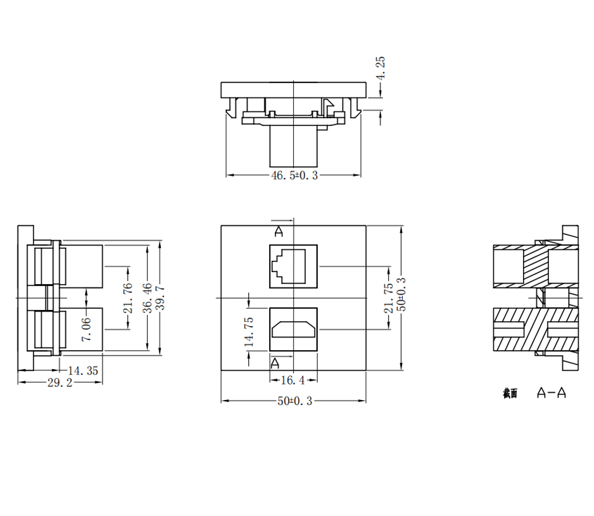 型 号:L-CAT-1(小款 模块) 用 途:HDM+网口模块、桌面HDM+网口插座模块、PDU机柜HDM+网口模块 尺 寸:50*50